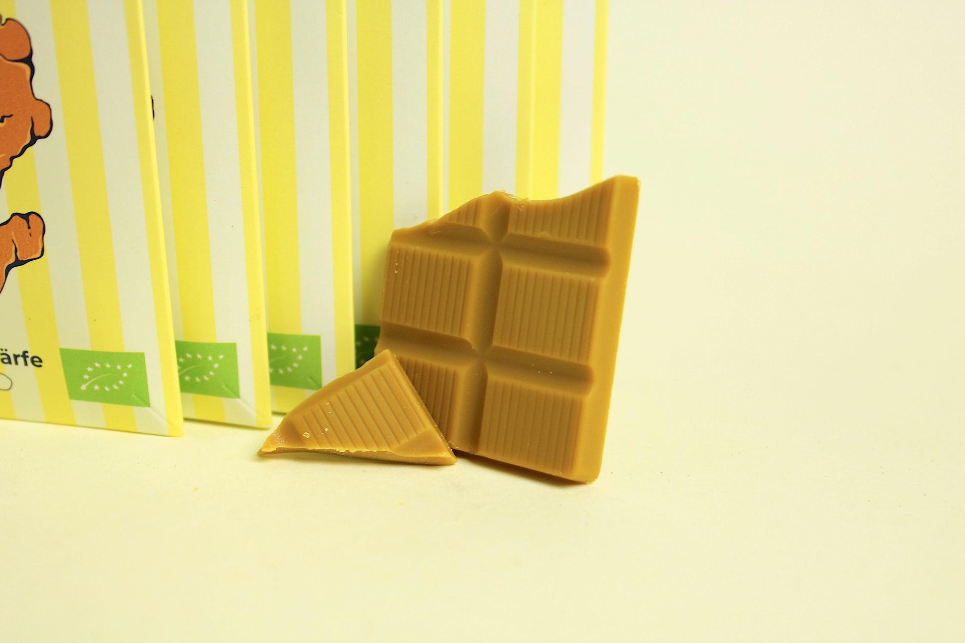Zutaten: Kakaobutter, Zucker, Ingwer getrocknet (12 %), Zitronensaftpulver (Zitronensaftkonzentrat getrocknet 4,8 %, Gummi arabicum), färbendes Lebensmittel (Konzentrat aus Kurkuma), schwarzer Pfeffer, Sonnenblumenlecithin, Ingweröl, Zitronenöl. Vor Wärme schützen.